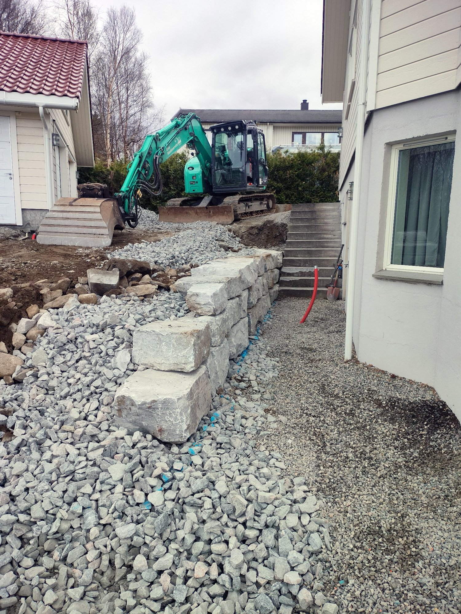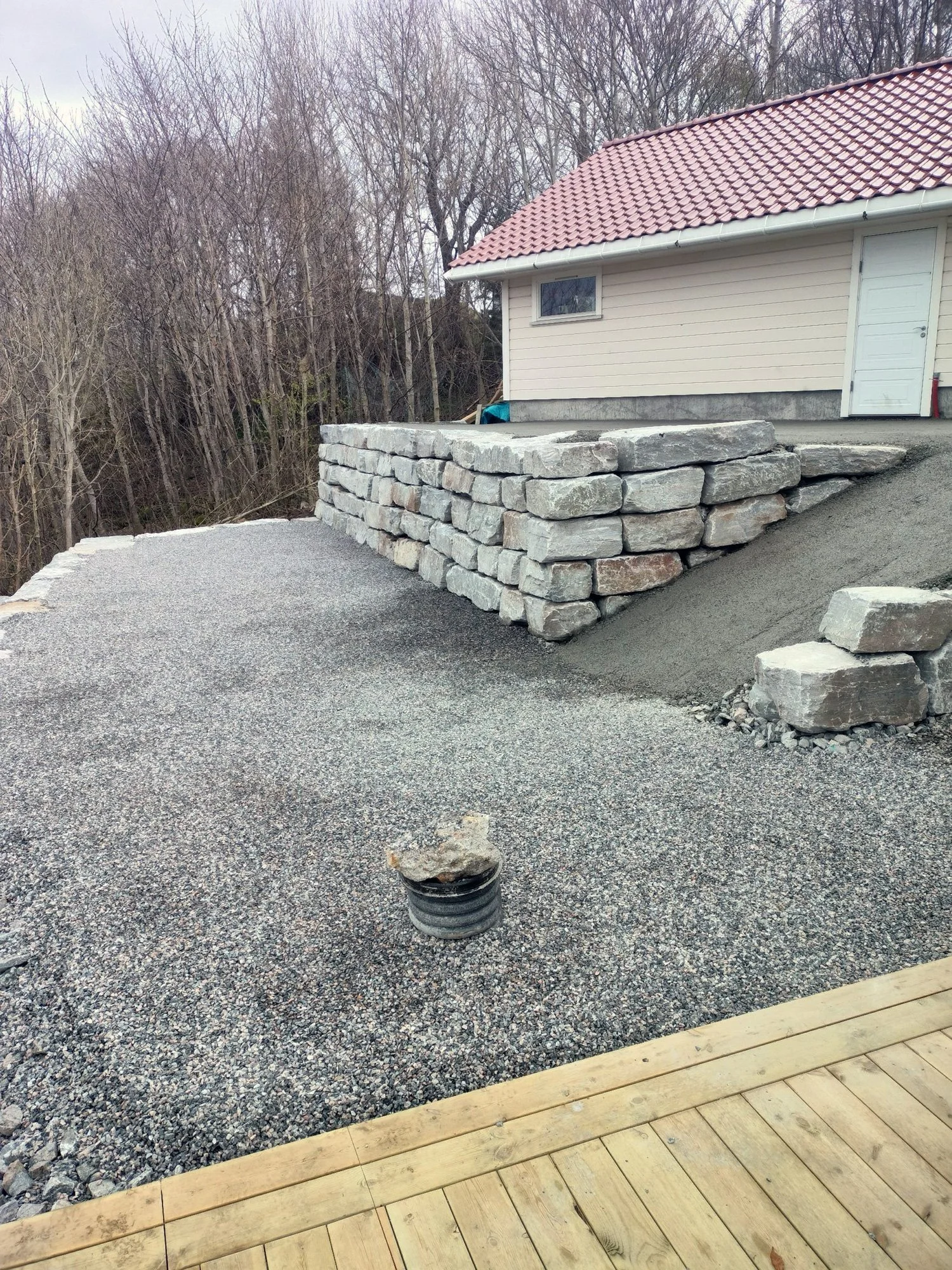 På ei krevjande tomt fekk vi gleda av å skape eit gjennomført og funksjonelt uteområde – frå planlegging til ferdig resultat. Arbeidet omfatta oppføring av støttemurar og trapp i naturstein, masseutskifting av grunn og etablering av drenering. I tillegg la vi gangbaneheller med tilhøyrande dreneringsrenner, og utførte forarbeid til asfaltering med formidling av asfalt. Resultatet vart eit komplett og gjennomført uteområde – eit produkt levert frå A til Å.
