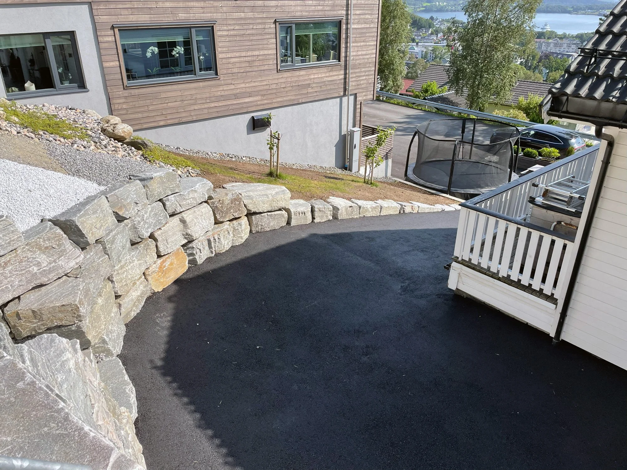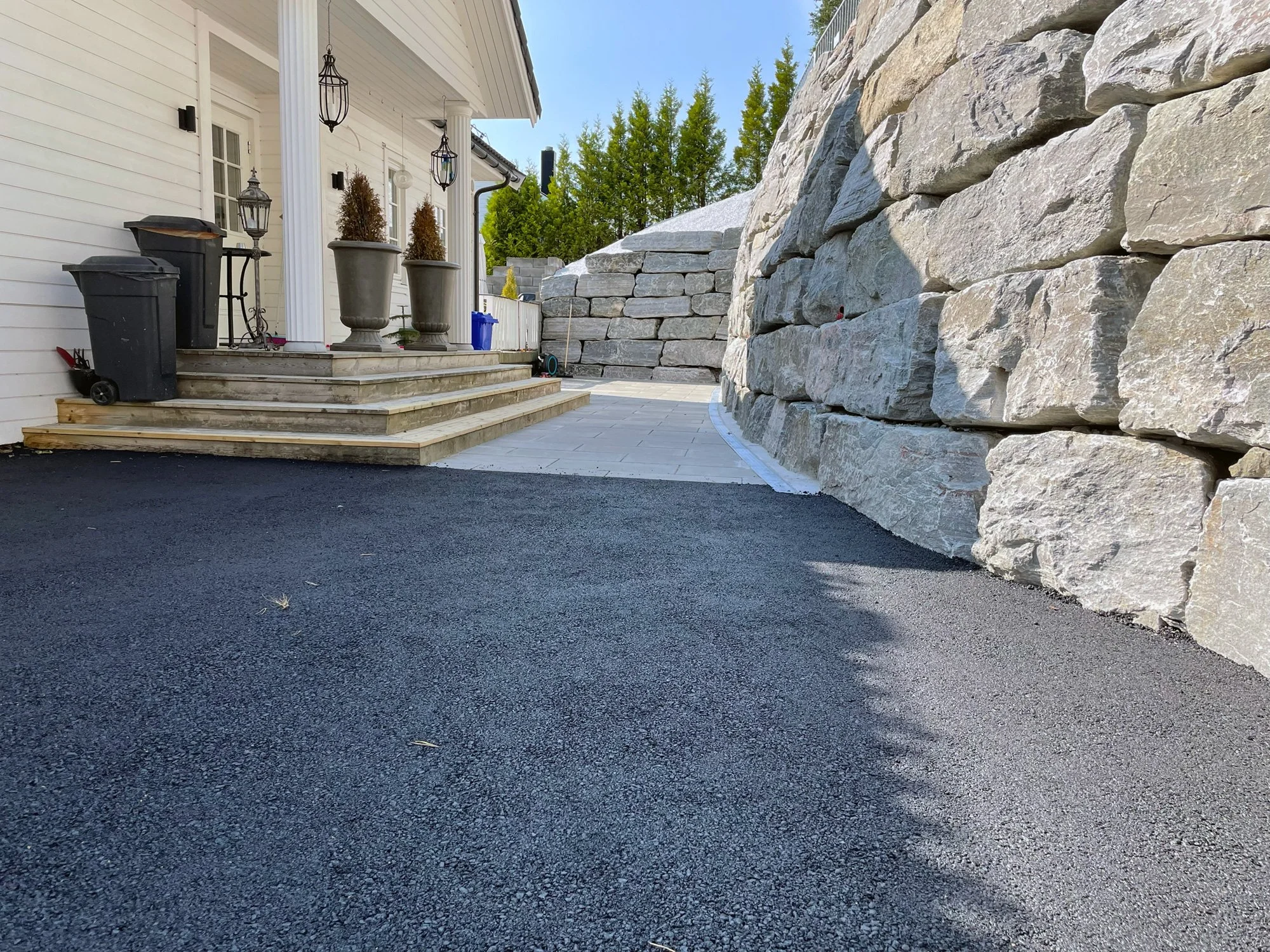 På ei krevjande tomt fekk vi gleda av å skape eit gjennomført og funksjonelt uteområde – frå planlegging til ferdig resultat. Arbeidet omfatta oppføring av støttemurar og trapp i naturstein, masseutskifting av grunn og etablering av drenering. I tillegg la vi gangbaneheller med tilhøyrande dreneringsrenner, og utførte forarbeid til asfaltering med formidling av asfalt. Resultatet vart eit komplett og gjennomført uteområde – eit produkt levert frå A til Å.